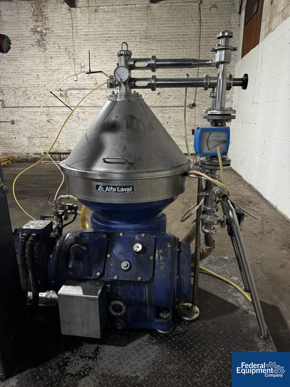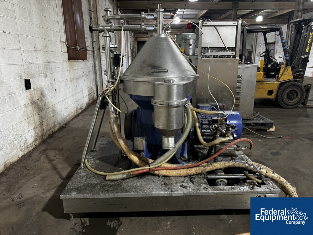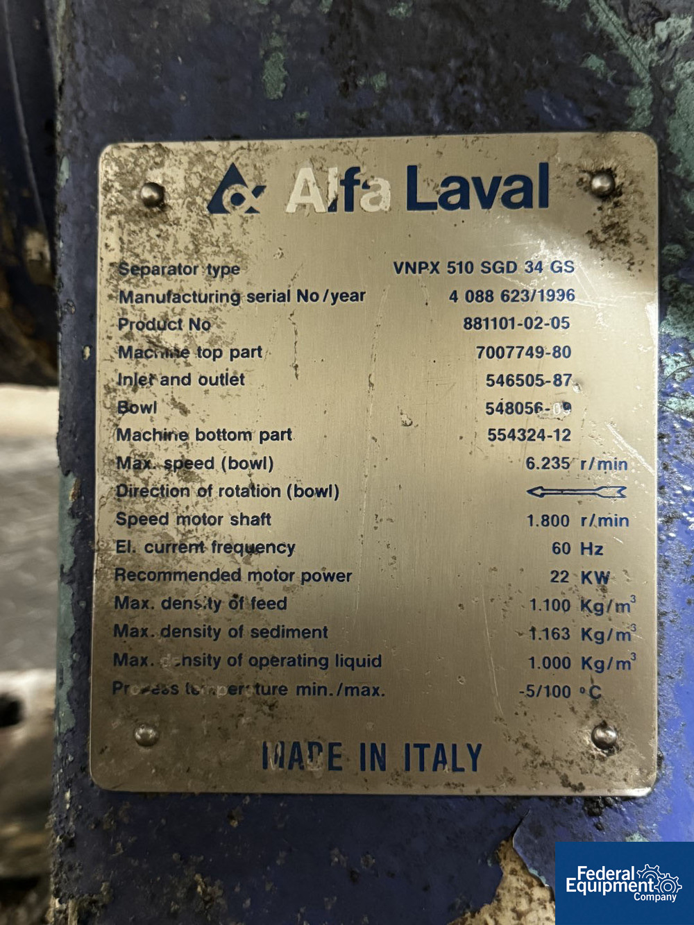 Used Alfa laval disc centrifuge clarifier, model VNPX 510 SGD 34 GS, stainless bowl, 6235 rpm max bowl speed, 22 kw motor, with onboard controls, serial# 4 088 623, built 1996.