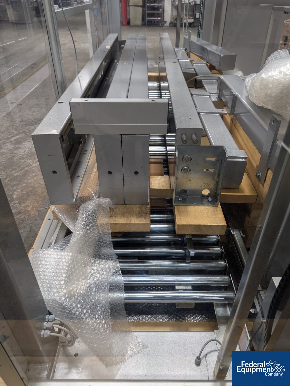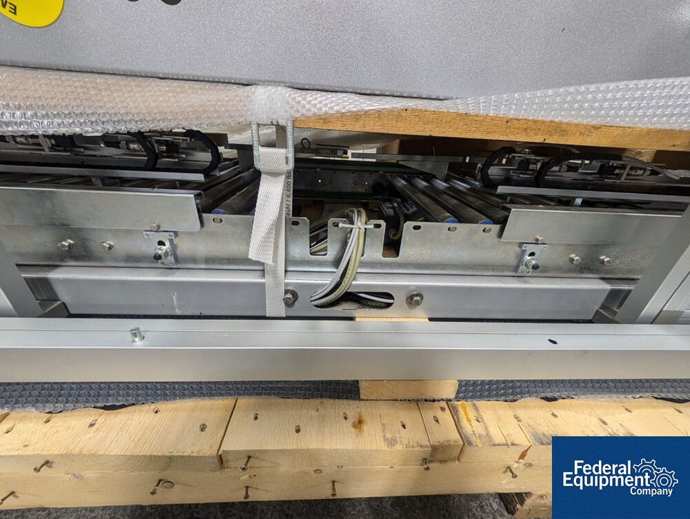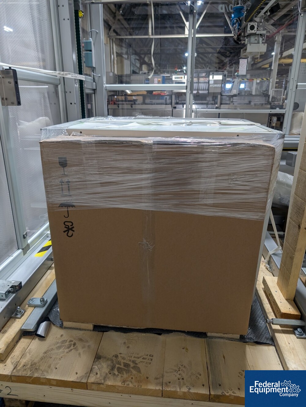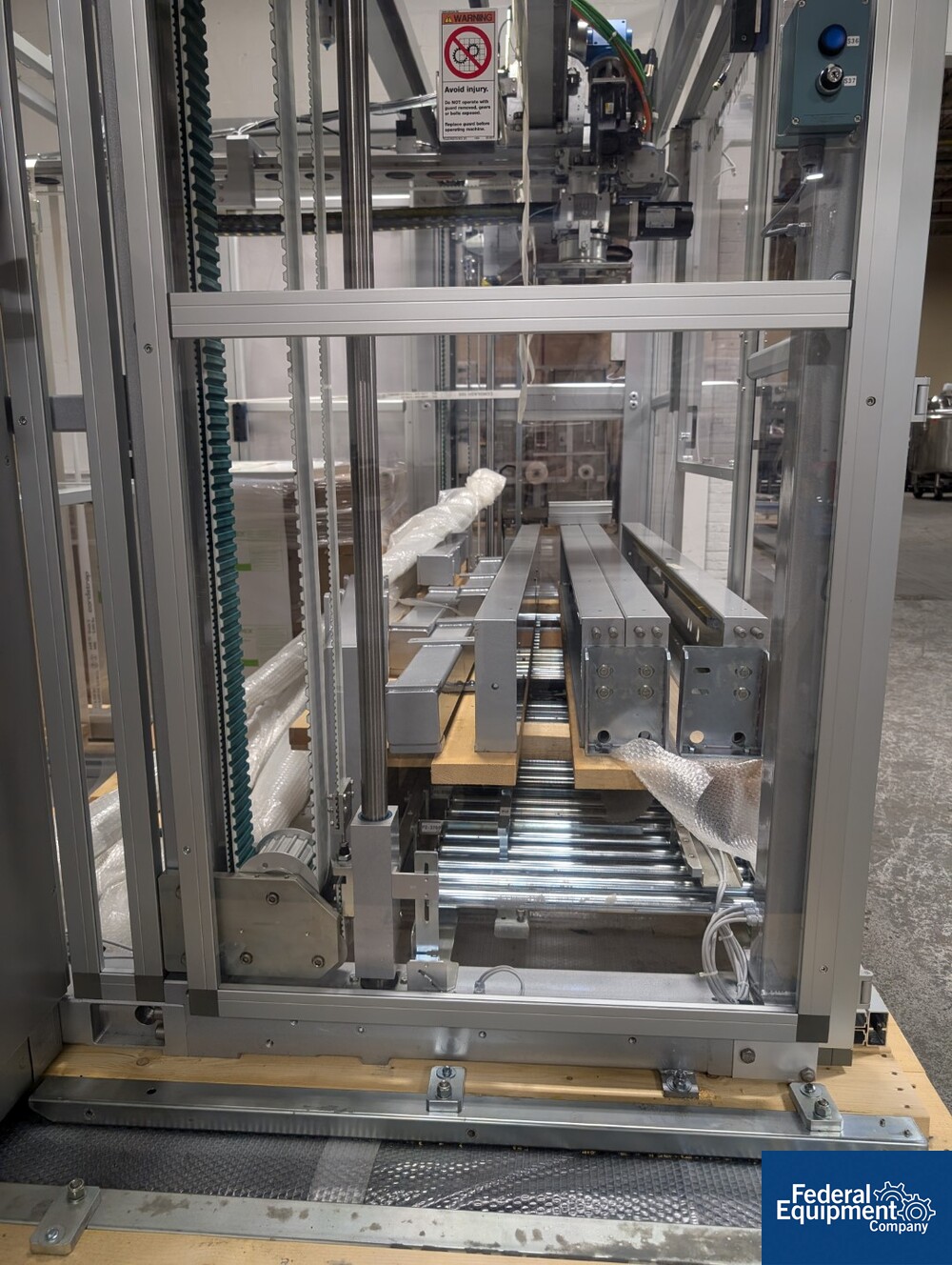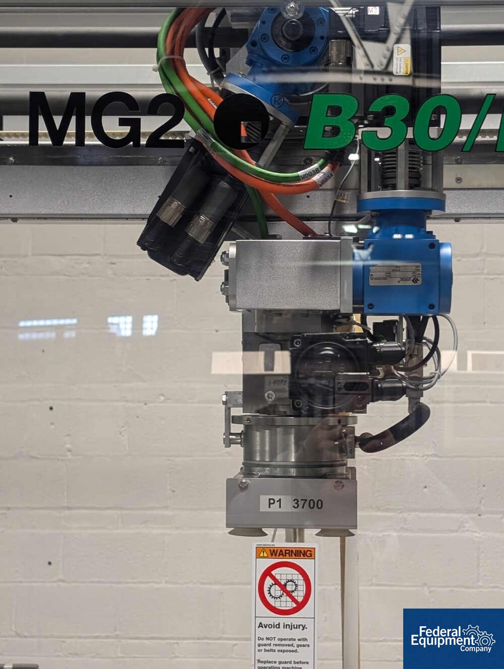 Unused MG2 robotic double-bay palletizer, model B30/D, with servo motors, 8 cycles/minute, 800×1,200 mm (EU) – 1,000×1,200 mm (US) pallets, 1,305 mm max height including pallet, Allen Bradley PLC controls with Panelview 1250 HMI, 480 volt, serial# C018, built 2021. Still on the original shipping skid.