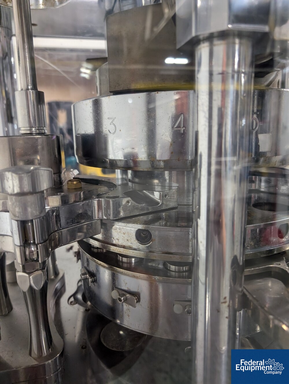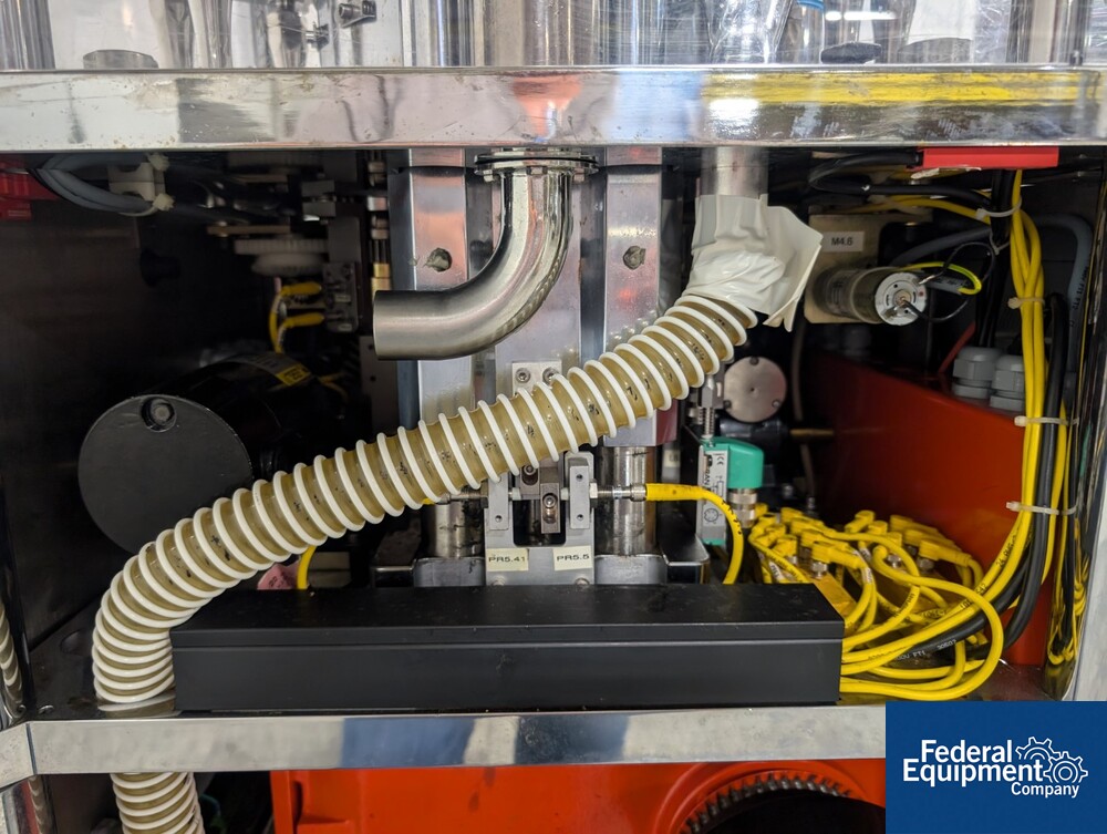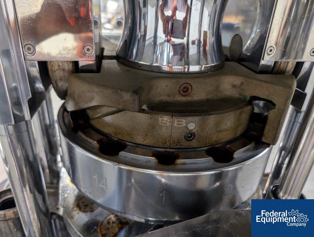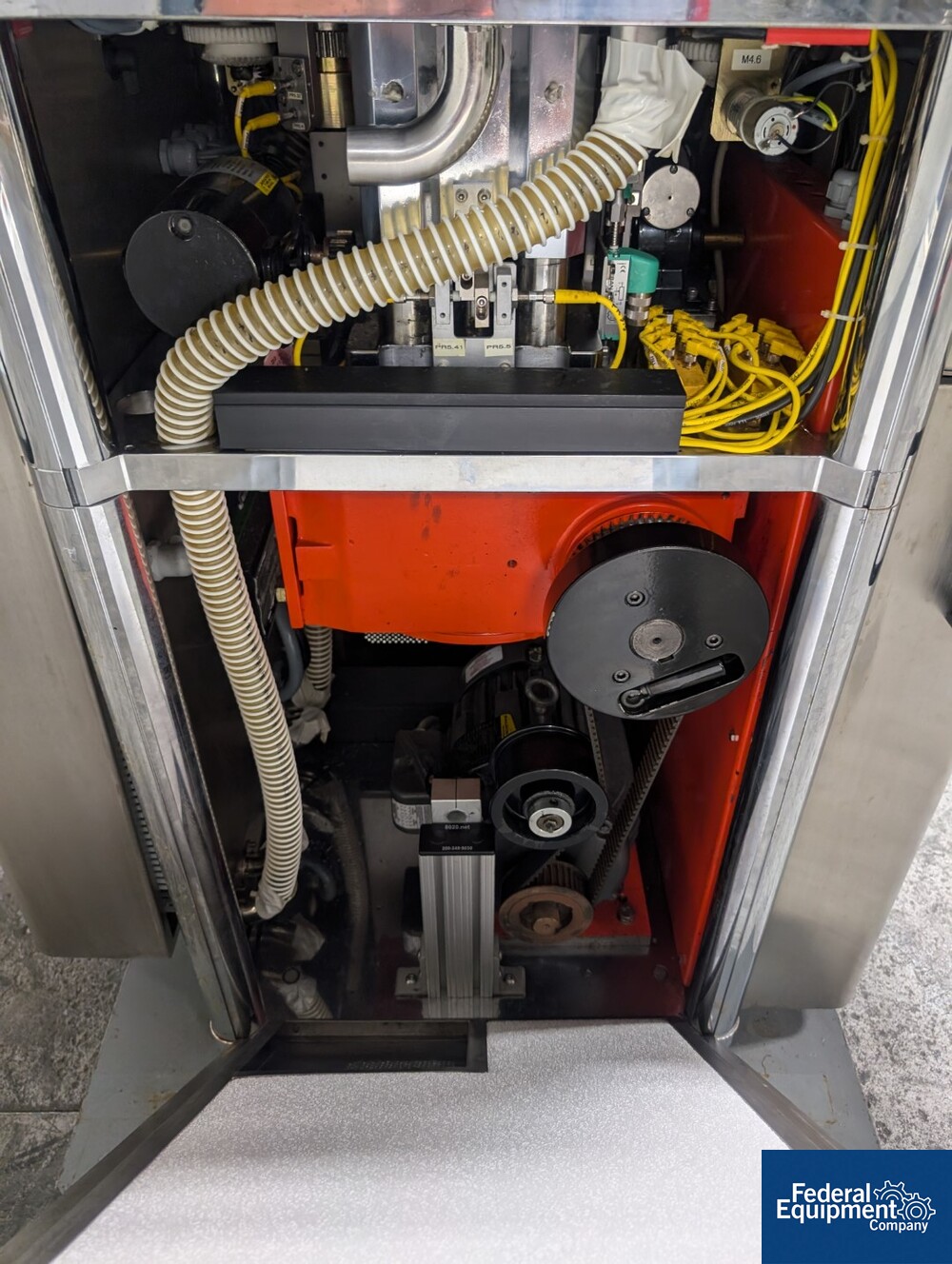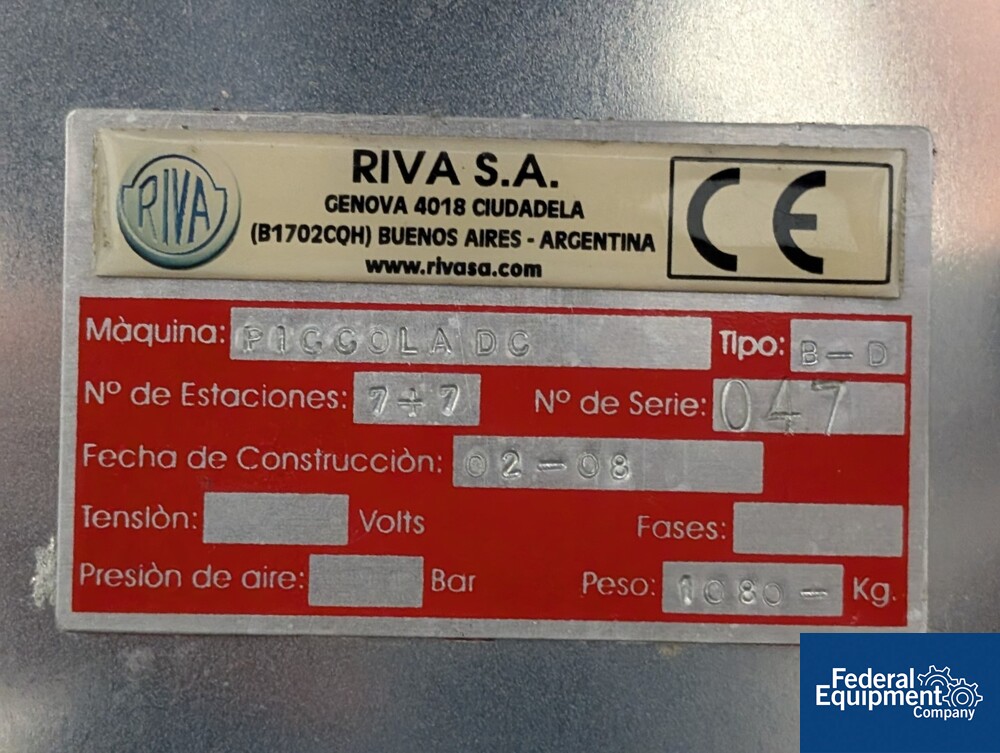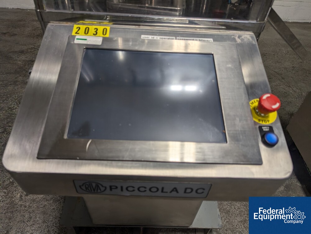 Used Riva Piccola bilayer rotary tablet press, model Piccola 7+7, with B & D turret tooling, 14 station total 7 station for each size, 80 Kn precompression, 80 Kn main compression, 17.5 mm B diameter, 24 mm D diameter, 18.5 mm depth of fill, dual sided with force feeders and hoppers, speeds up to 21,000 tablets/hour, plc controls with touchscreen, serial# 047, built 2008. Unit requires refurbishment, including new controls.