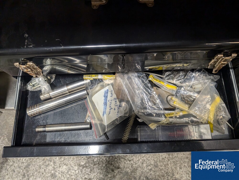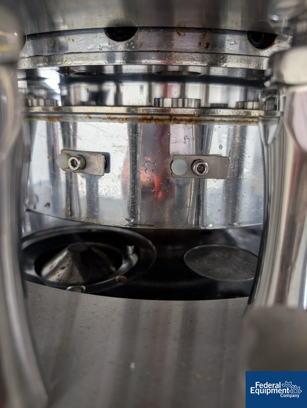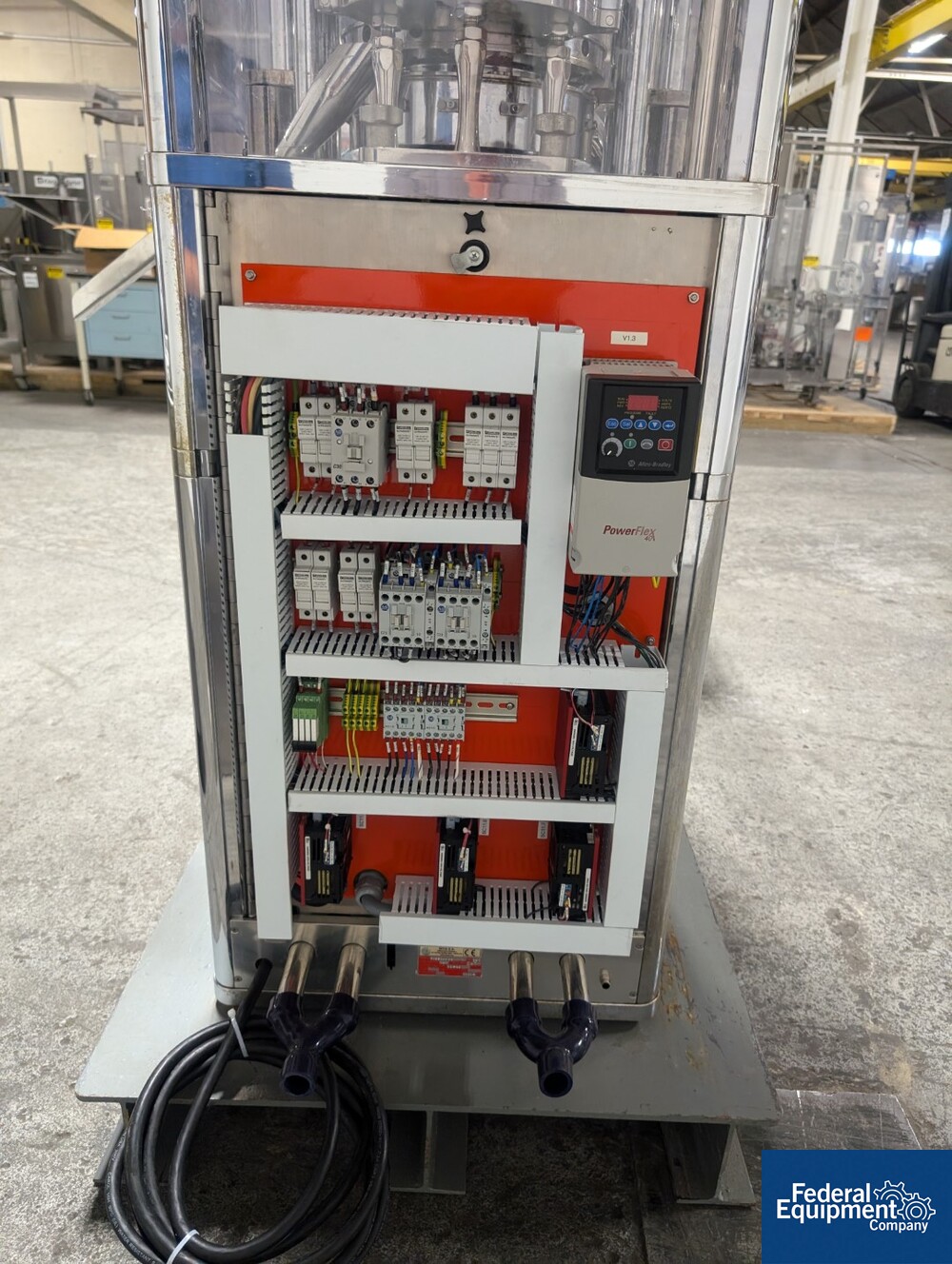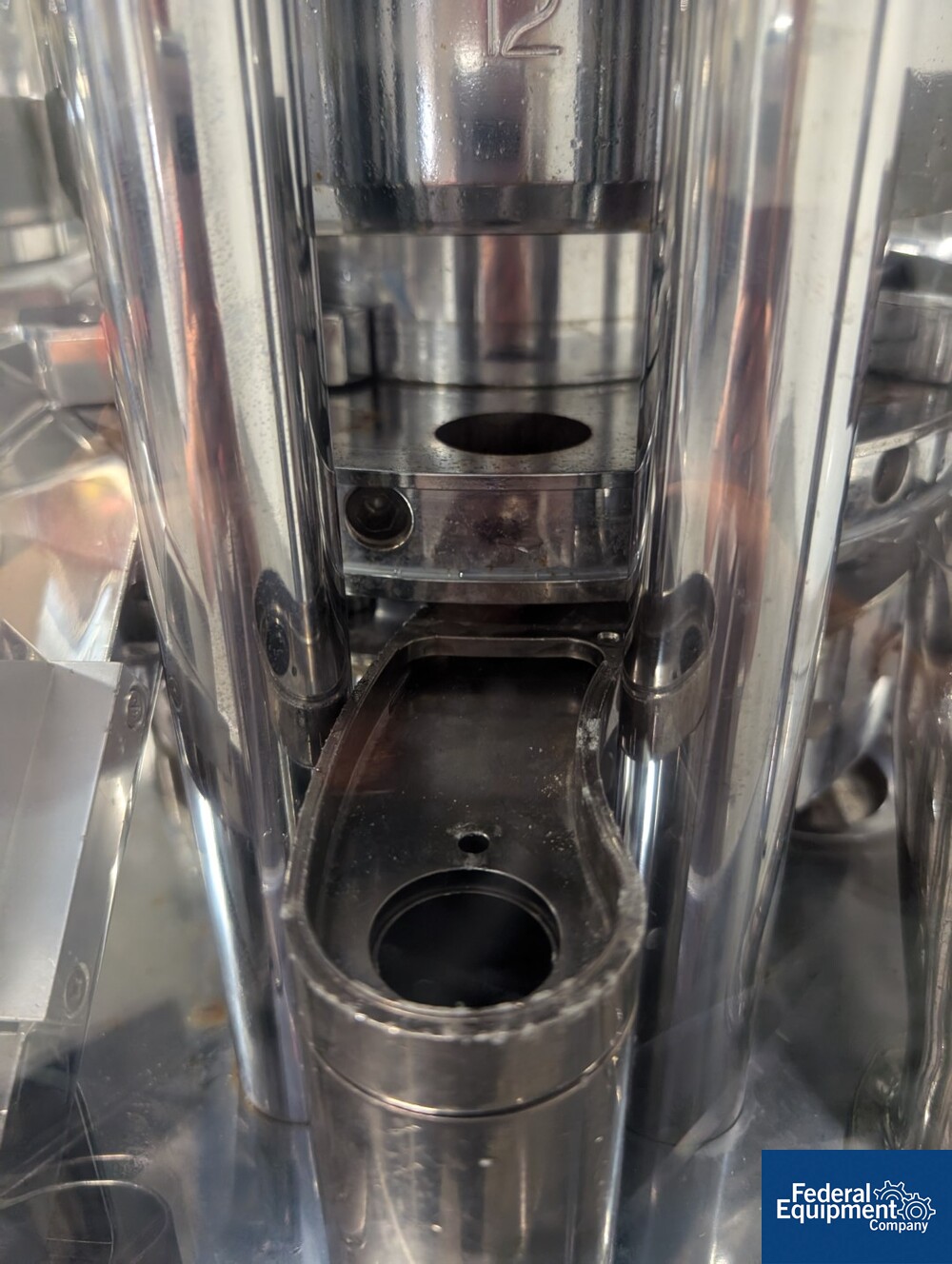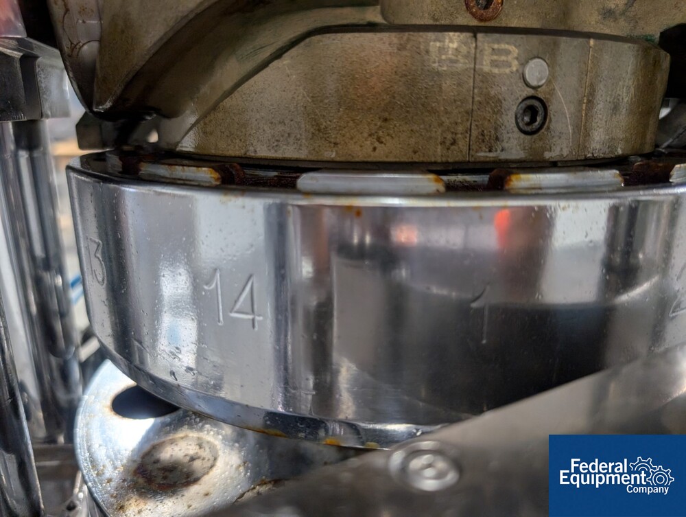 Used Riva Piccola bilayer rotary tablet press, model Piccola 7+7, with B & D turret tooling, 14 station total 7 station for each size, 80 Kn precompression, 80 Kn main compression, 17.5 mm B diameter, 24 mm D diameter, 18.5 mm depth of fill, dual sided with force feeders and hoppers, speeds up to 21,000 tablets/hour, plc controls with touchscreen, serial# 047, built 2008. Unit requires refurbishment, including new controls.
