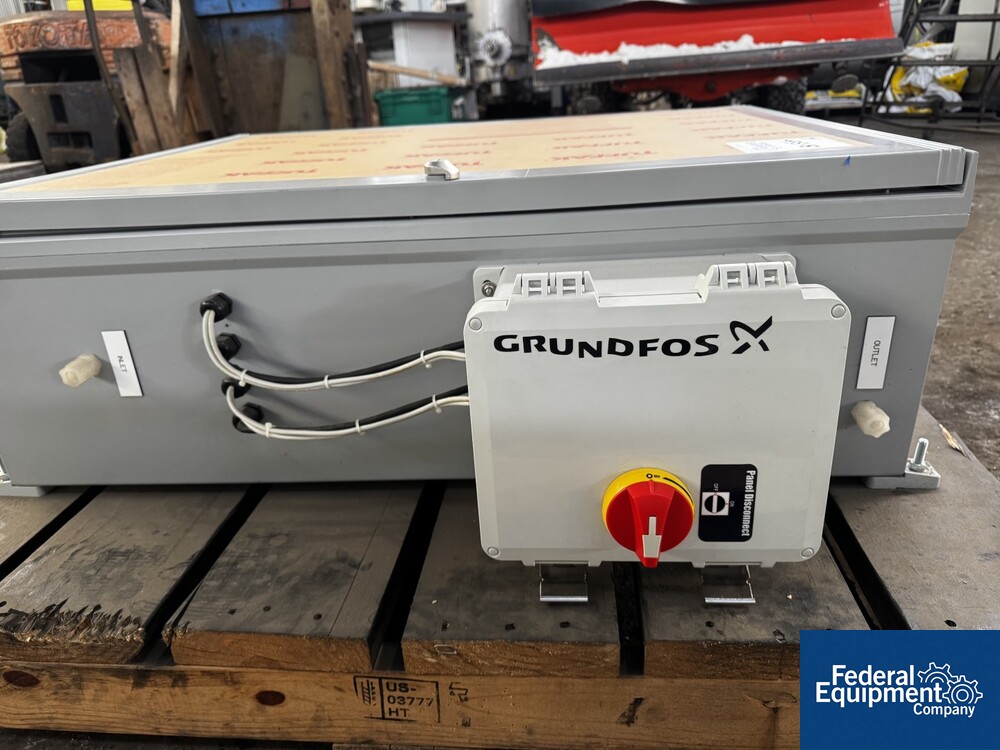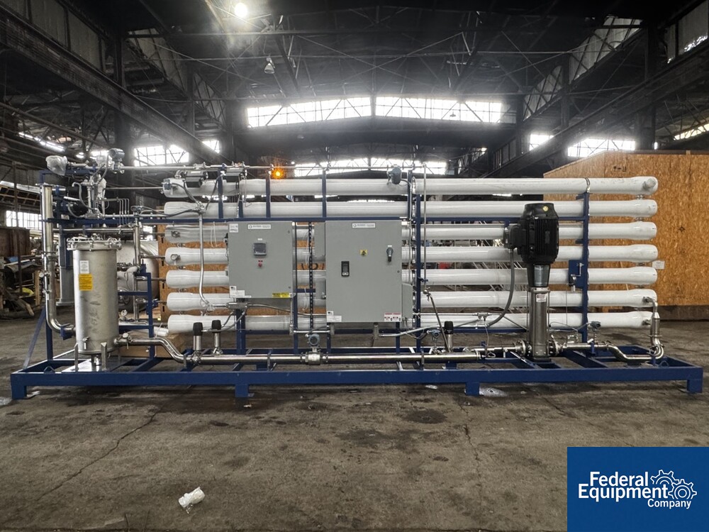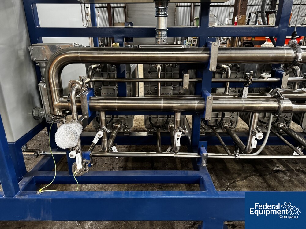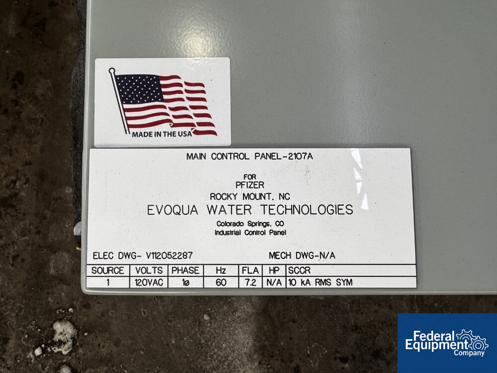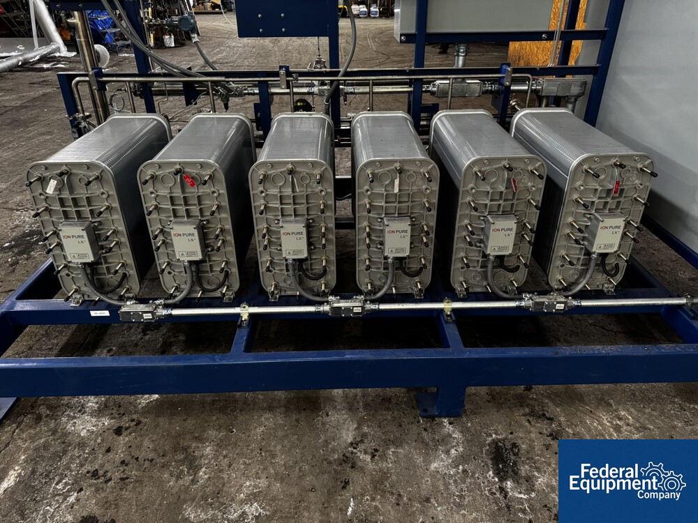 Used Evoqua Water Technologies RO/DI Water System, with (6) tube RO system, prefilter, 60 hp Grundfos pump, skid mounted with RIO Panel and power distribution panel, CDI continuous electrodeionization unit, (6) IonPure LX units, Carbon Tower bed, main control panel with HMI, serial# 10262039, built 2023.